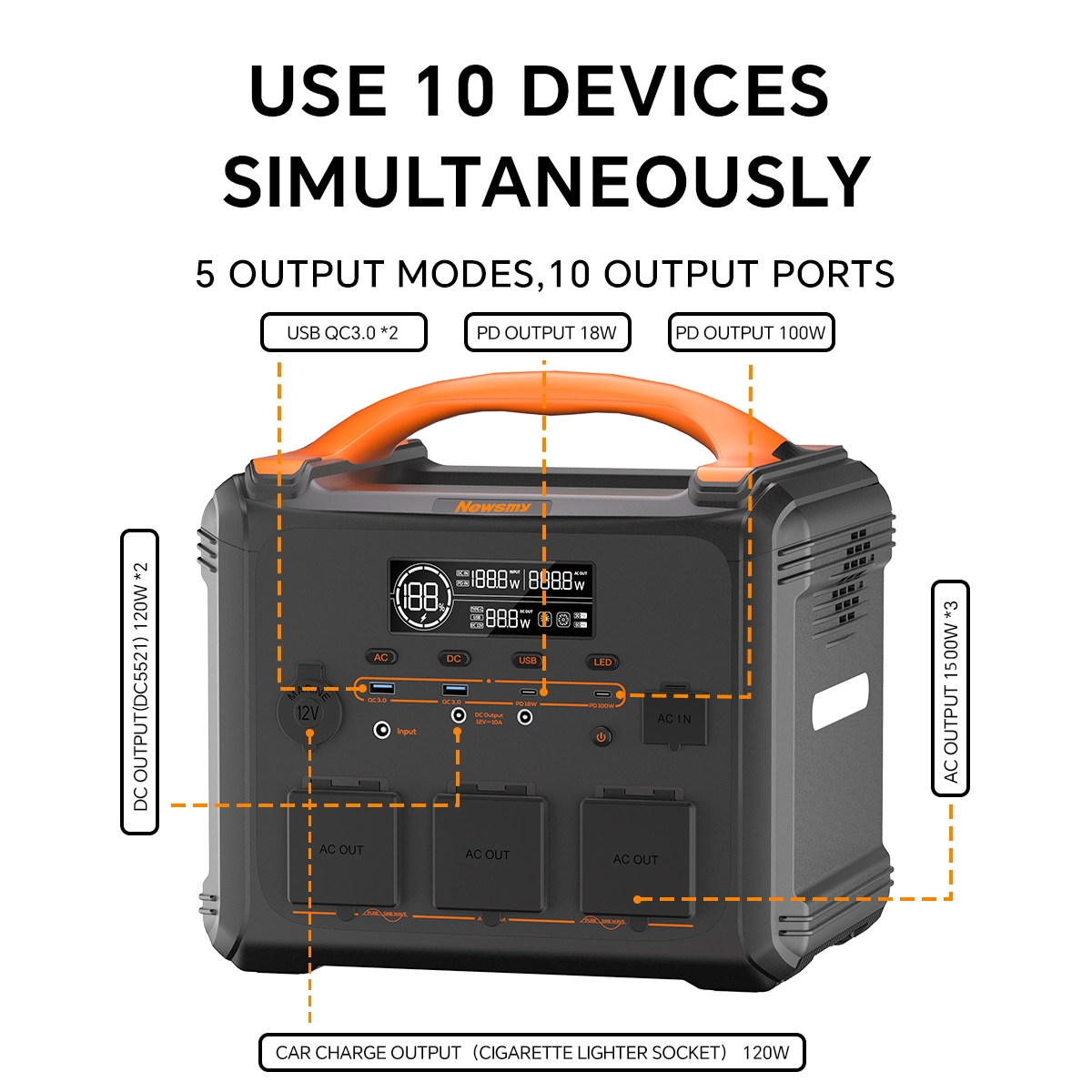 Vielseitige Ladezentrale: Diese Mobiler Stromspeicher verfügt über 10 Ausgangsanschlüsse, darunter 2 x USB QC3.0, 2 x DC5521, 1 x PD18W, 1 x PD 100W, 1 x Zigarettenanzünderbuchse und 3 x 1500W AC-Ausgänge.
